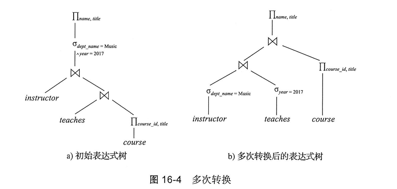 查询优化器可以使用等价规则来系统地产生与给定的查询表达式等价的表达式,表达式的代价时根据统计信息来计算的。