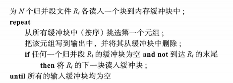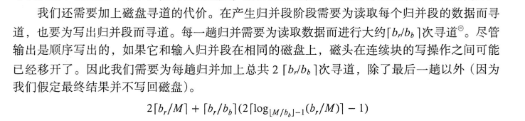 代价分析:令\(b_r\)为包含关系r的记录块数,在第一阶段读入关系的每个块然后将它们重新写出,共需要\(2b_r\)次块传输。初始归并段的数量为\(\lceil \frac{b_r}{M} \rceil\),在贵宾过程中,每次在一个归并段中读入一个块会导致大量寻道,所以尽量一次读取或写入更多的块,表示为\(b_b\),这就需要将\(b_b\)个缓冲块分配给输入的归并段和输出的归并段。每趟归并可以归并\(\left\lfloor \frac{M}{b_b} \right\rfloor -1\)个归并段。总共需要的趟数为\(\left\lceil \log_{M/b_b-1} \left\lceil \frac{b_r}{M} \right\rceil \right\rceil\)。