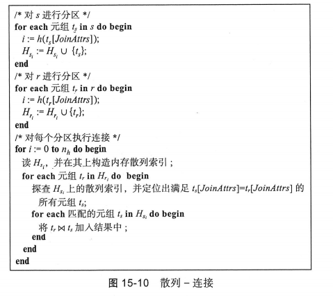 使用散列函数h来划分两个关系的元组,基本思想是把每个关系的元组划分成在连接属性值上具有相同散列值的集合。