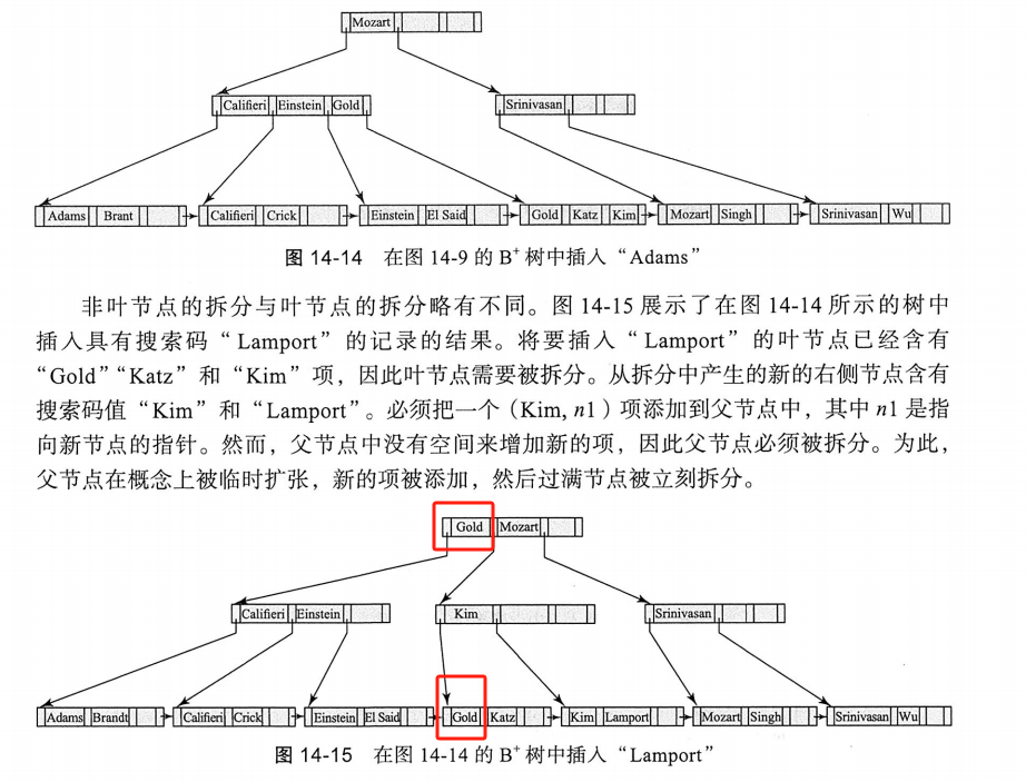 在B+Tree中要注意的一点是,每个非叶节点的搜索码\(K_i\)实际上是对应的那个右子树(比如\(K_i\)对应\(i+1\)个子树(1index))的最左侧的搜索码(也就是大于它的最小数,比如上面的根的Gold和子节点的Gold。