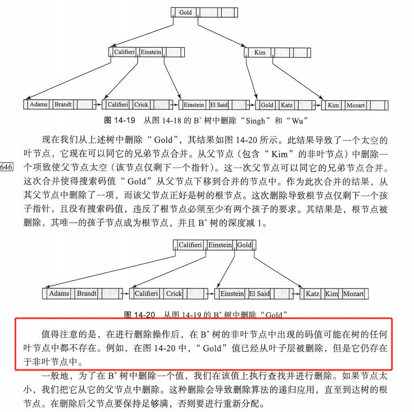 这个对Gold的删除也很有趣,导致了树的降层,并且在进行了删除后,非叶子节点上的值有可能在叶子节点中不存在,见图中红框。