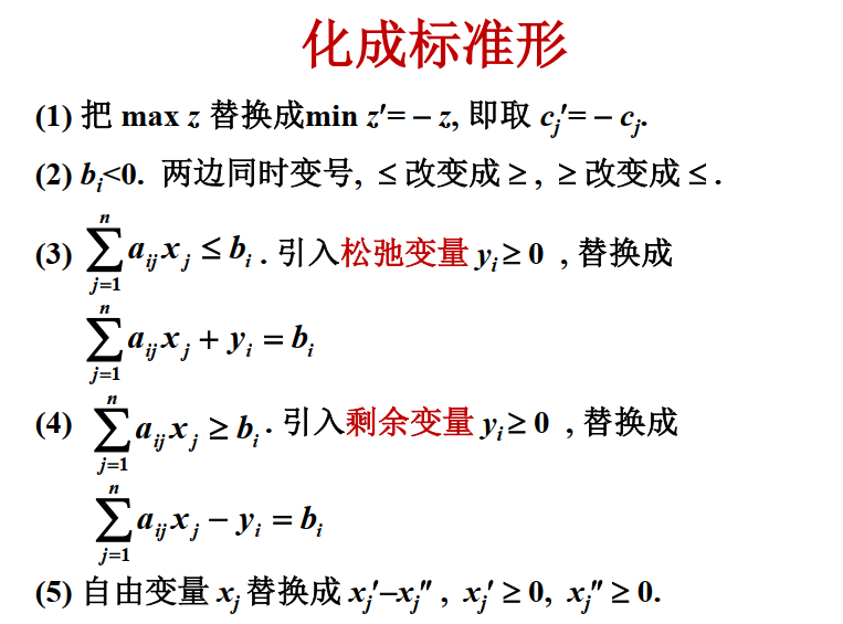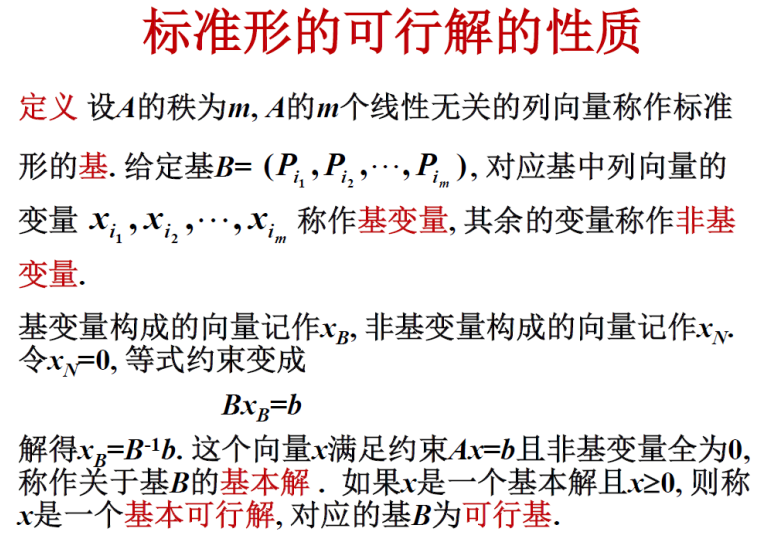 - 可行解:满足约束条件的解(等式约束和非负约束)