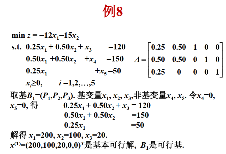 此时基本可行解为: \(\(x_B^{(0)}=B^{-1}b, \quad x_N^{(0)}=0, \quad 目标函数值 \quad z_0 = c_B^TB^{-1}b\)\)