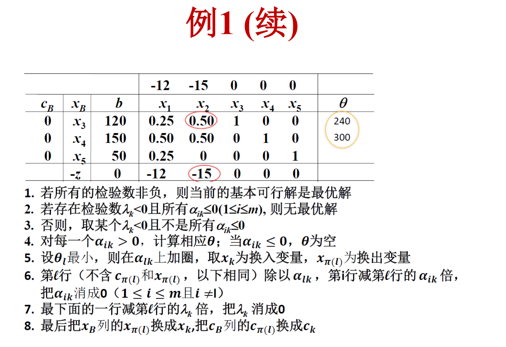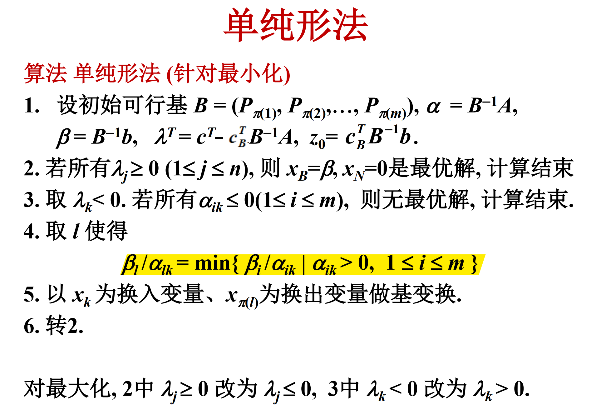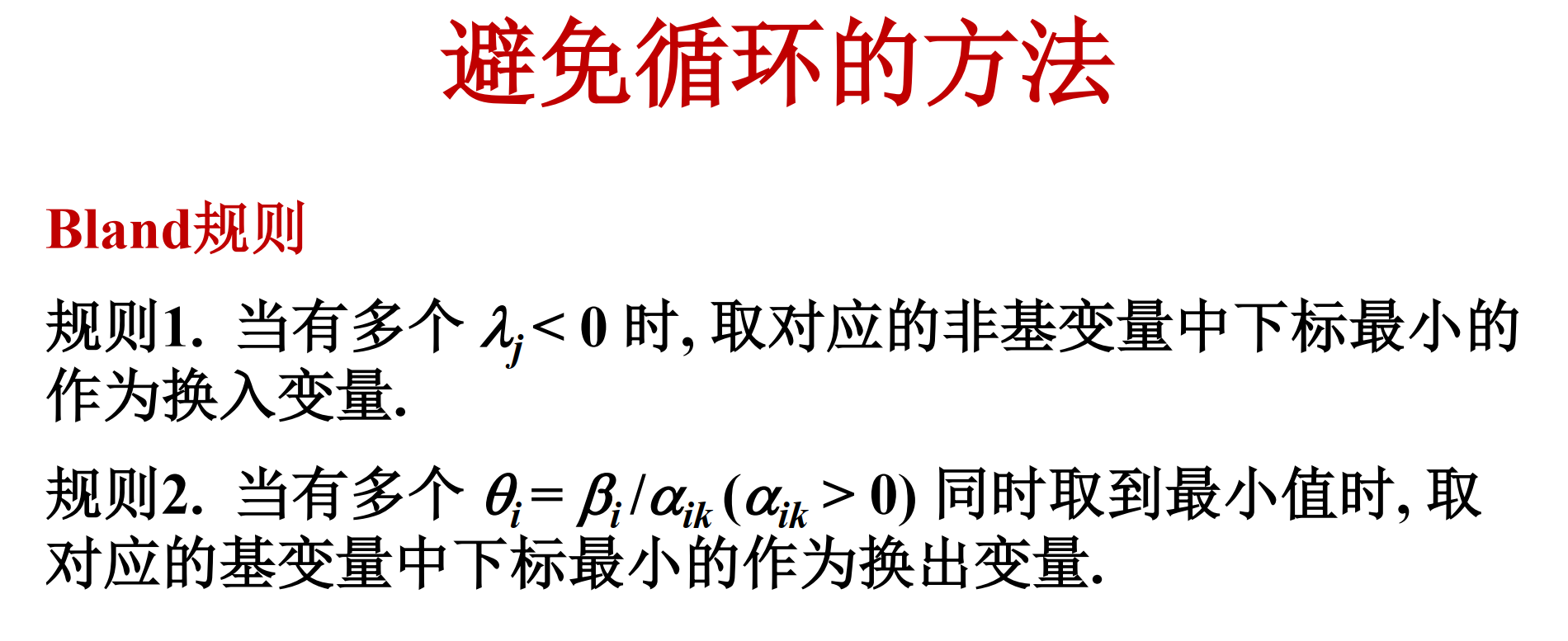 - 否则在 \(\alpha_{lj} < 0\) 中选择使 \(|\lambda_j / \alpha_{lj}|\) 最小的 \(j\) 作为换入变量