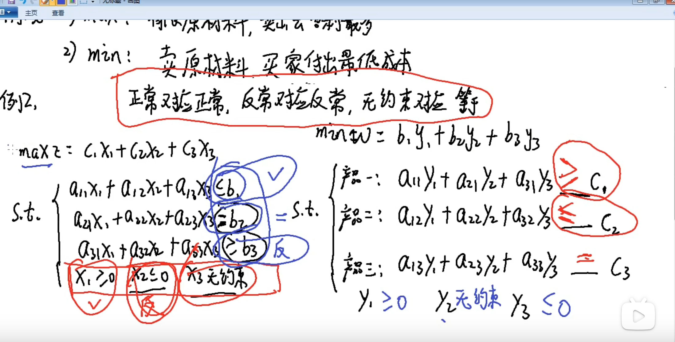 不过另一个比较好的不用记反不反常的就是把等式全部变式成小于等于,然后y的约束就是大于等于0和无约束了(相反),然后y的等式约束全部和x的取值约束方向相同。
