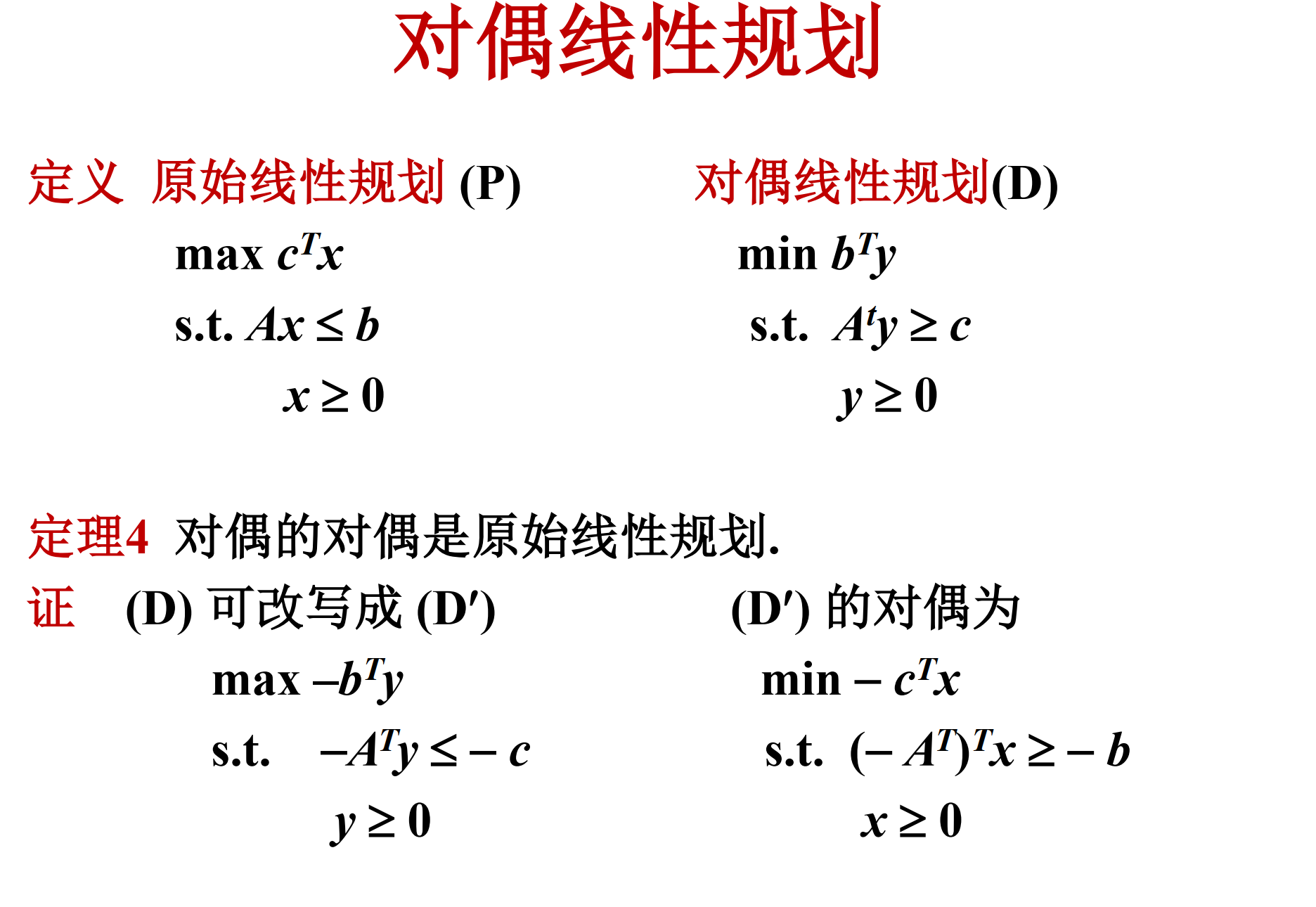 定理6 设 x 是原始规划 (P) 的可行解, y是对偶规划 (D) 的可行解, 则 \(c^Tx = b^Ty\) 当且仅当 x 和 y 分别是原始规划和对偶规划的最优解
