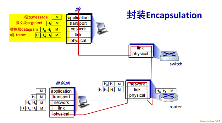 实际使用中会把报文切分为多个分组,然后进行流水线传输,假设一个分组穿越一个stage需要花费时间t,一共有k跳,总时间就是\((k-1+n)t\),n是分组数量。