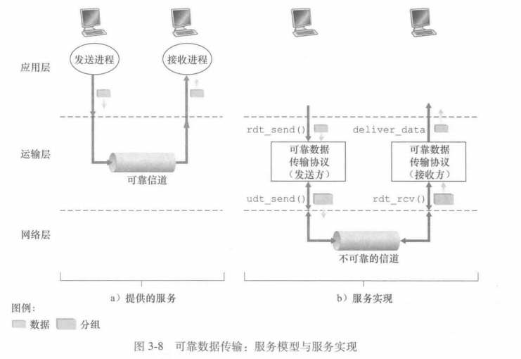 可靠数据传输是这样的一种抽象:数据可以通过一条可靠的信道传输,其比特不会损坏,也不会丢失,且按序到达。