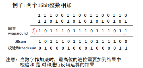 checksum计算: 先求和,溢出的话回环加到最低位。然后求反码。验证时把原本的所有字节求和再加上checksum,不为全1就代表数据包损坏。