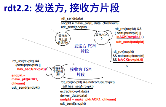 rdt2.2: 与rdt2.1相同,但仅使用ack,ack回复确认的分组序号