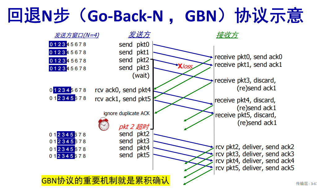 - GoBack-N: 如果一个分组丢失,则重传所有已发送但未确认的分组