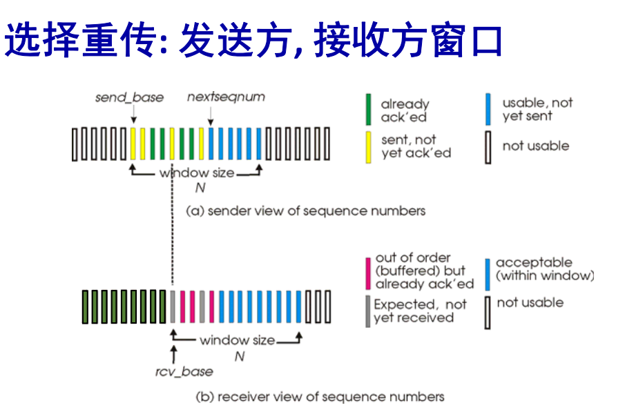 - 选择重传: 如果一个分组丢失,则只重传丢失的分组