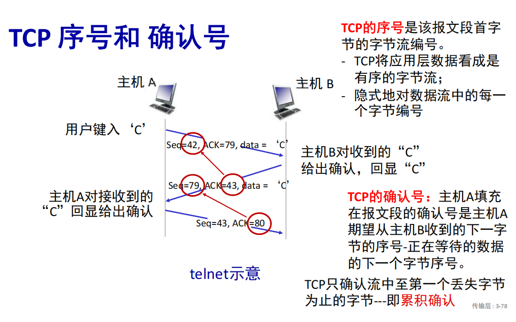 确认号:期望收到对方下一个报文段中的第一个数据字节的序号,使用累计确认