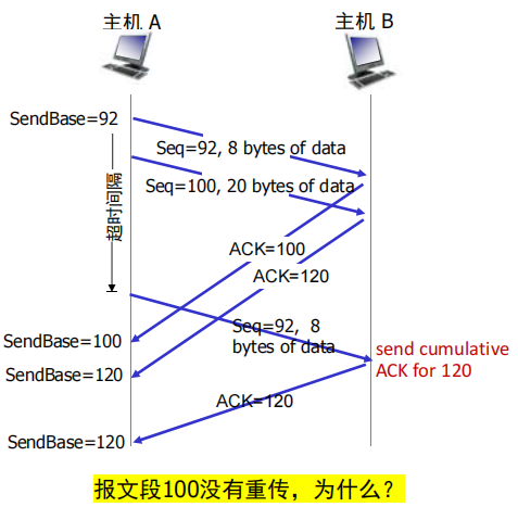 可以看上面这一张图,由于累计确认的存在,ACK 120意味着120以前的都已经收到了,即使没有收到ACK 100,也可以跳过100的重传。