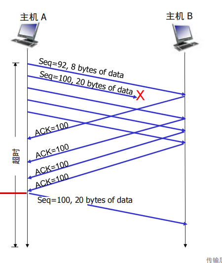 为什么累计确认要三次才重传:堆在一块的一两个包可能由于传播中环境因素的干扰出现了乱序,但只要三个都接收到了就是符合预期的(因为带序号,接收方可以直接自己排序),一次两次就直接重传可能会有浪费。但如果累计确认三次,大概率就是完全丢了。可以理解为一种tradeoff。