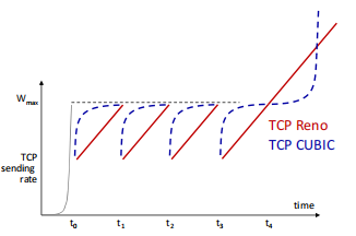基于丢包进行拥塞控制,定义W是丢包时的发送速率,拥塞时先减半,一开始先以较快的速度爬升到接近\(W_{max}\)的地方,然后以以一个较慢的速度接近\(W_{max}\)。