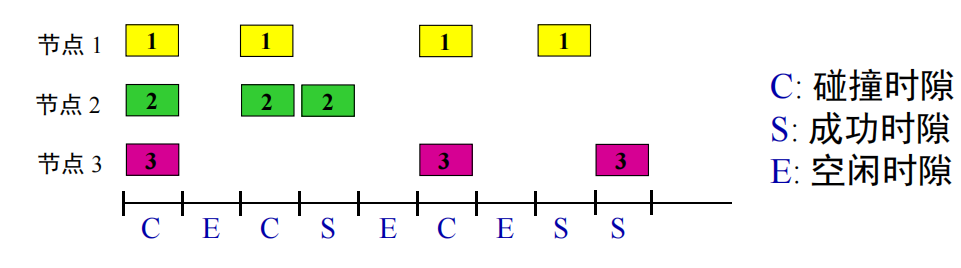 时隙ALOHA:将时间划分为时间帧,所有时间帧大小相同,用户在时隙开始时发送数据,节点是同步的,每个节点都知道时隙何时开始,如果发生碰撞,则等待下一个时隙(以概率p重传,直到成功传输)