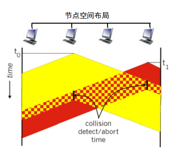 CSMA/CD: 有碰撞检测的CSMA,当一个节点再传输时一直侦听,检测到碰撞后就停止传输,减少信道浪费