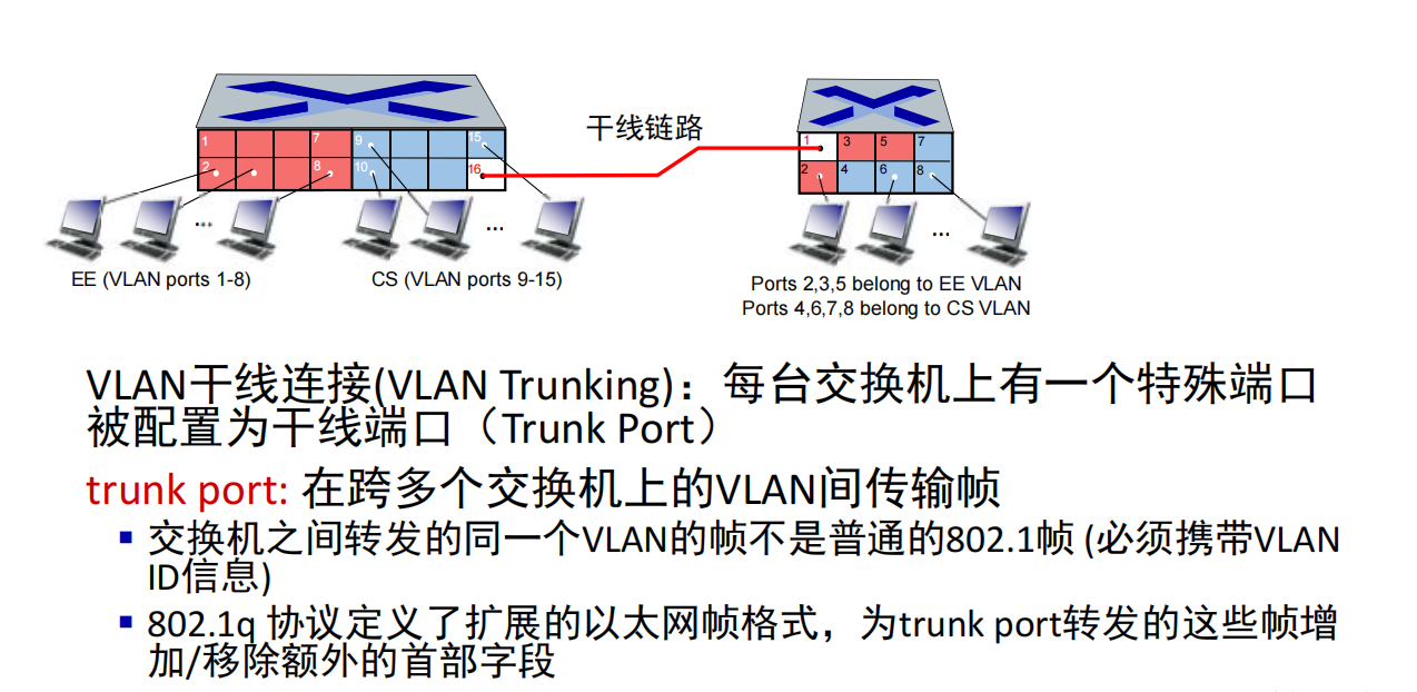 trunk port: 在跨多个交换机的vlan间传输帧