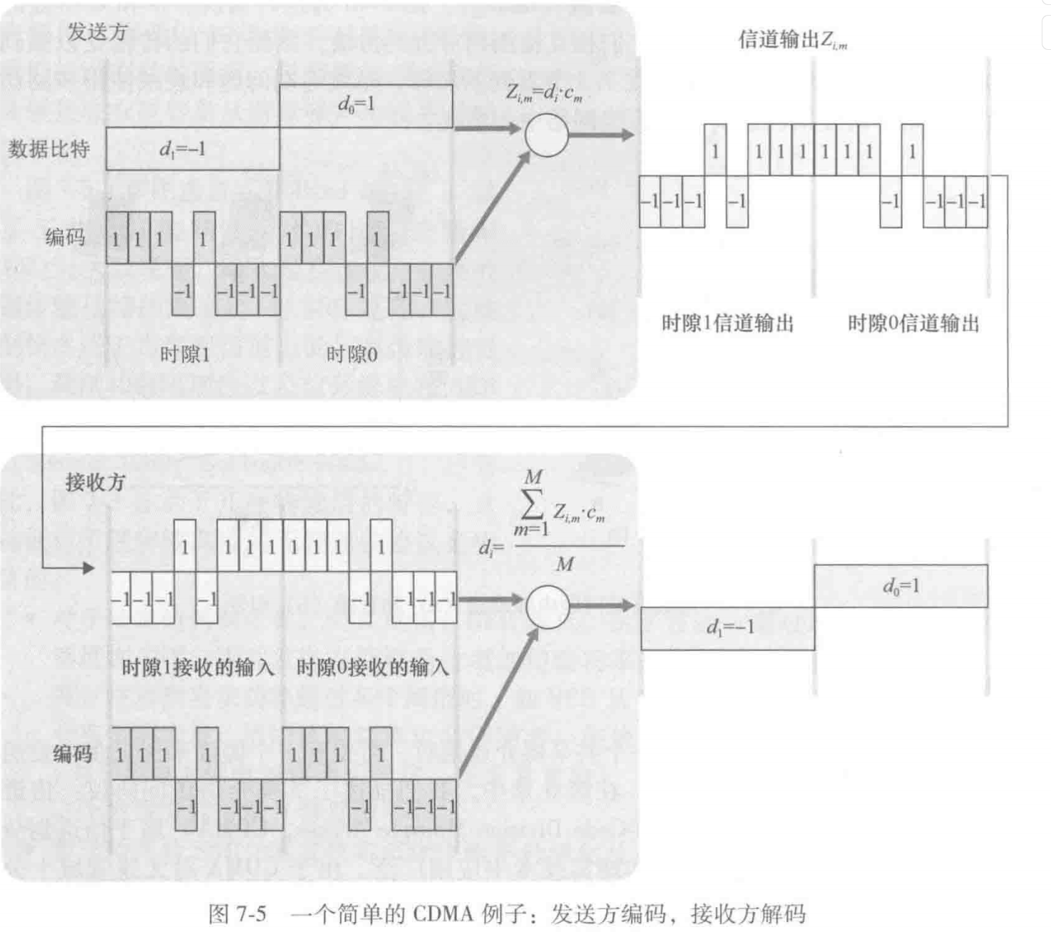 设\(d_i\)为发送的比特,\(Z_i\)为发送的码片,\(c_m\)为发送方使用的CDMA编码,一共有M个。则\(Z_{i,m} = d_i \cdot c_m\)。