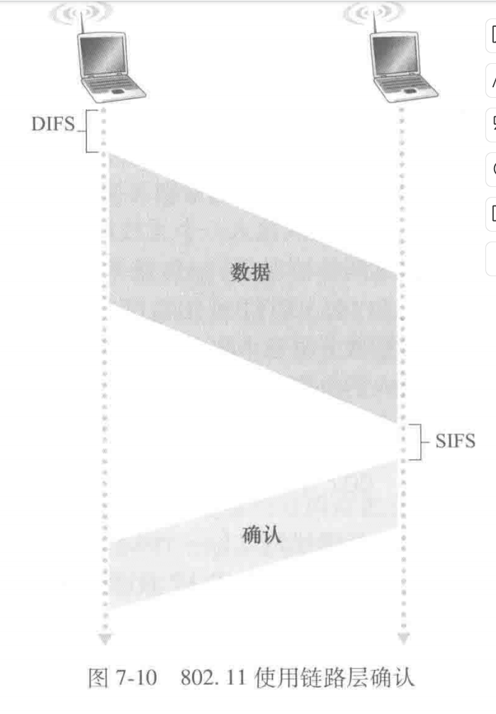 链路层确认:目的站点在接收到一个通过CRC校验的帧后,等待一个被称为短帧间间隔(SIFS)的一小段时间后,发送一个确认帧,如果发送站点在给定的时间内未收到确认帧,就会假定出现了错误并重传该帧。如果若干次重传后仍然未收到确认,传输站将会放弃该帧。