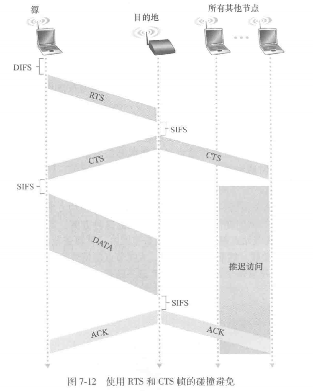 针对这种情况,802.11引入了短请求发送(Request to Send, RTS)控制帧和允许发送(Clear to Send, CTS)控制帧来预约对信道的访问。