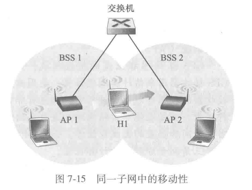 当H1从BSS1移动到BSS2中,它可以保持自己的IP地址和所有正在进行的TCP连接。如果互联设备是一个路由器,则H1必须在它移动进入的子网中获得一个新的地址,这种地址的变化将打断在H1中进行的任何TCP连接。使用网络层移动协议(如移动IP)可以避免这种情况。